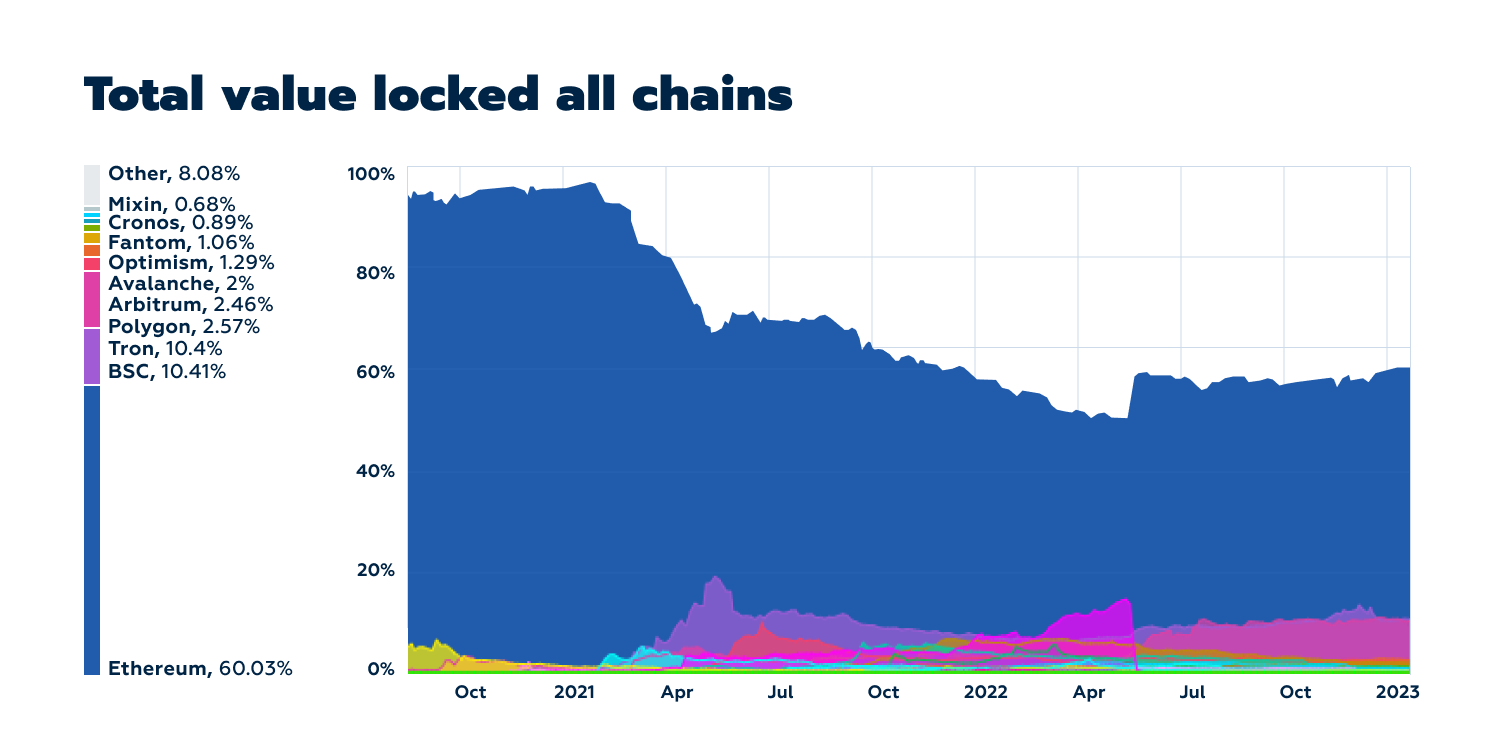 This DefiLlama chart illustrates almost 60% of all Defi TVL is locked on Ethereum. This makes bridging liquidity from Ethereum a high priority for Equilibrium.