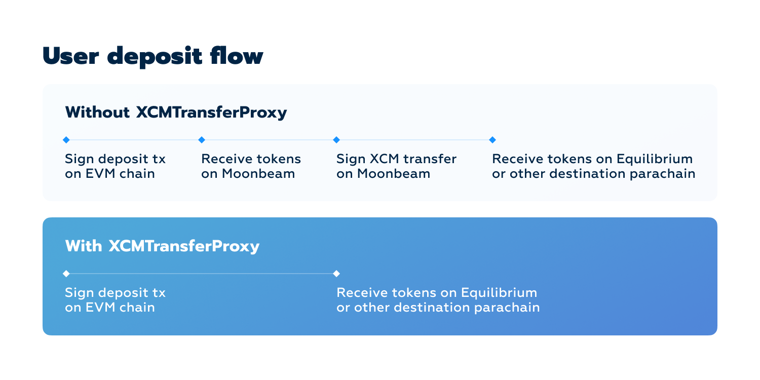Equilibrium implemented `XcmTransferProxy` for transferring tokens from Moonbeam to another parachain without additional user transactions. The code for this is on Github.